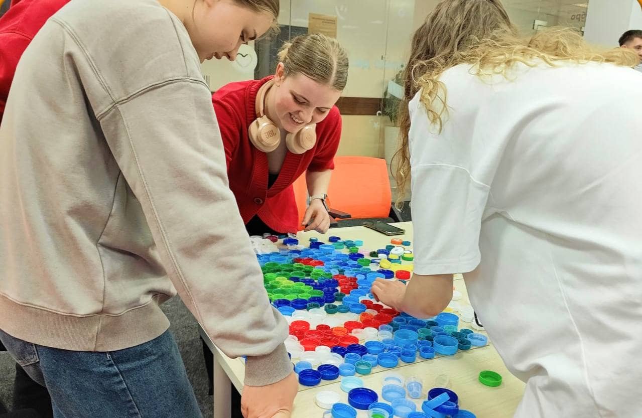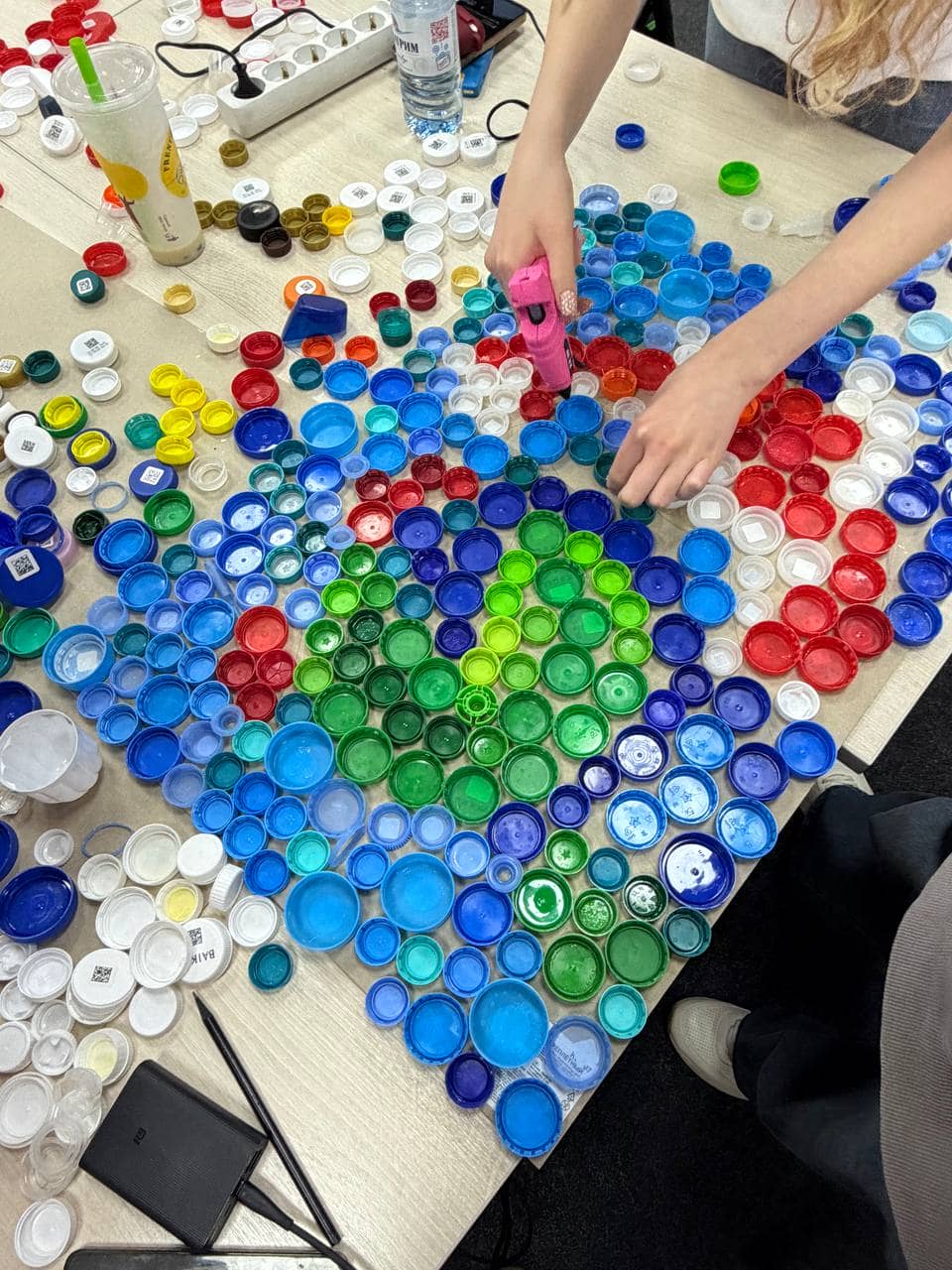 После лекции участникам предстояло создать, используя пластиковые крышки, клеевые пистолеты и подготовленные основы для картин, коллективные работы на экологическую тематику, включая изображения морских пейзажей, флоры и фауны озер.